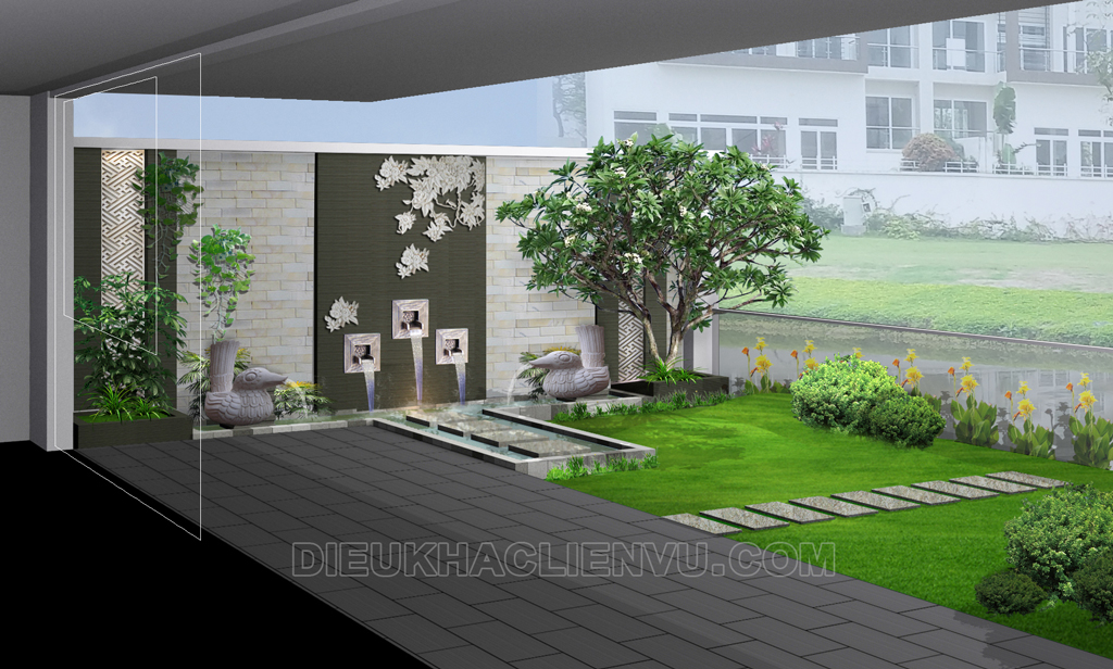 Tiểu cảnh sân sau của khu Ciputra đã đáp ứng được các yêu cầu tưởng chừng vô lý nêu trên. Với không gian thiên mầu chủ đạo ghi, nâu,trắng tạo nên sự tối giản nhưng tinh tế, phù điêu chỉ là chum hoa buông lơi nhẹ nhàng thay vì hình khối vuuong tròn thông thường, một chút nước thôi với ánh đèn lung linh làm không gian thiền nhưng không bị tẻ nhạt nhàm chán.