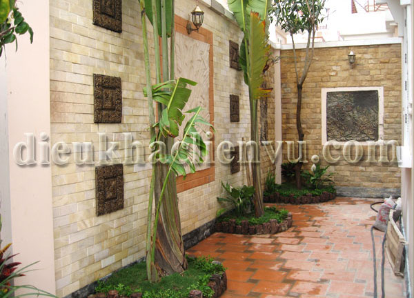 Tiểu cảnh khô được xây dựng trong sân vườn với cây xanh, cỏ, hoa lá kết hợp với một vài bức tranh phù điêu.