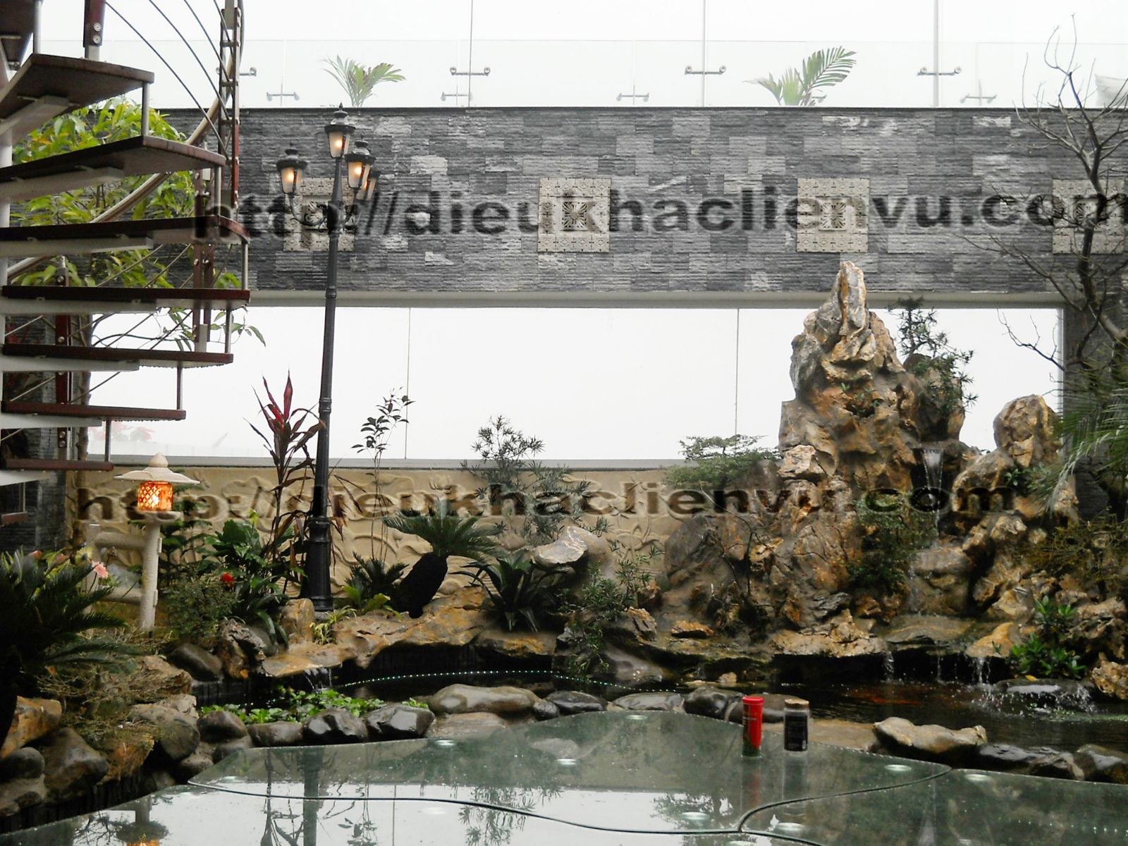 tiểu cảnh nước gồm một dãy núi cao thấp, đen xen là những cây và bụi cây nhỏ, dưới chân núi có đàn cá đang tung tăng bơi lội. Dưới ánh đèn dọi sáng lung linh góc tiểu cảnh nước hiện lên như một thiên đường trên mặt đất.